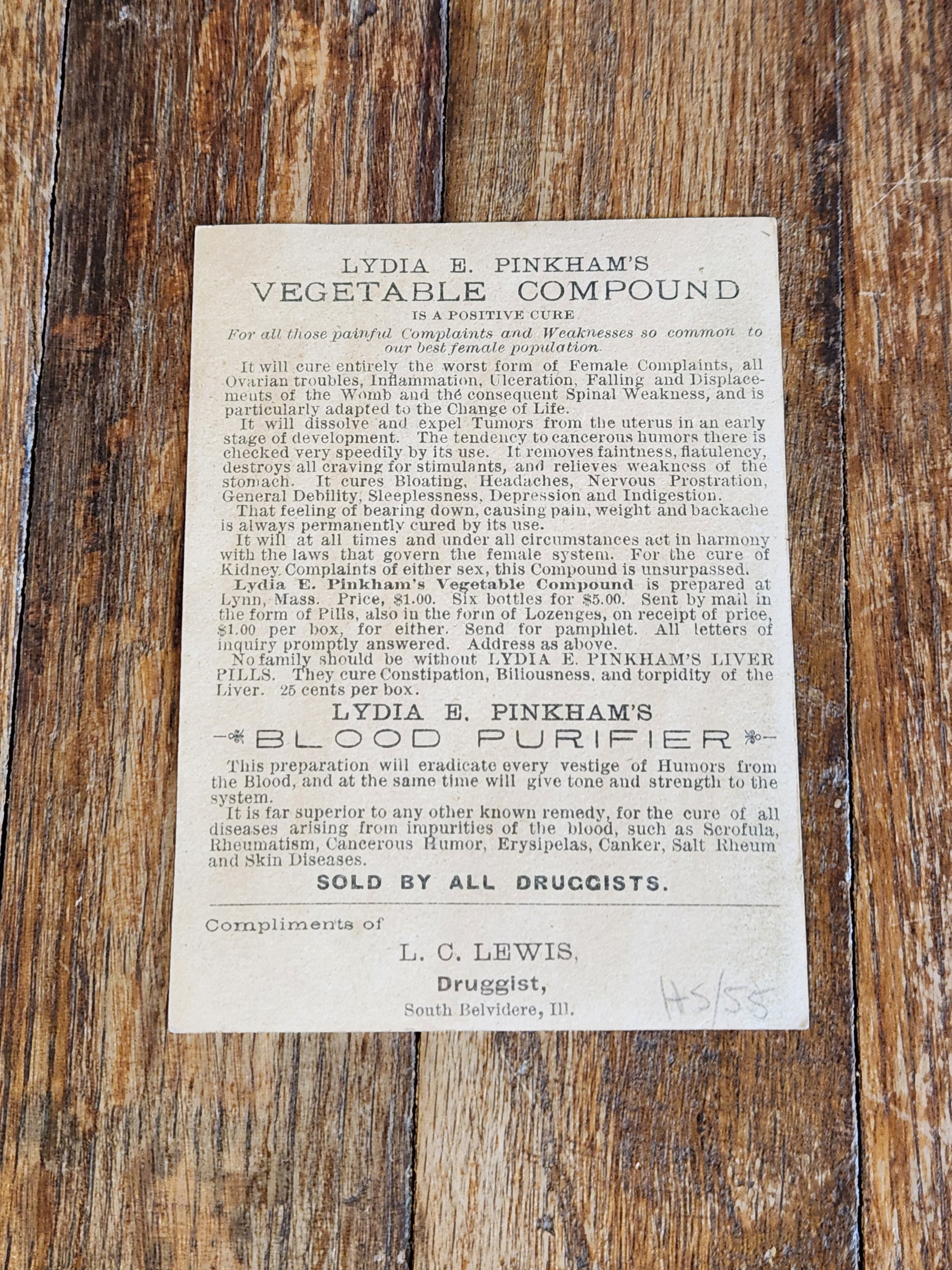 The reverse contains extensive promotional text for Pinkham’s Vegetable Compound, Blood Purifier, and Liver Pills, including period medical claims and pricing, along with the imprint for L. C. Lewis, Druggist, South Belvidere, Illinois.
