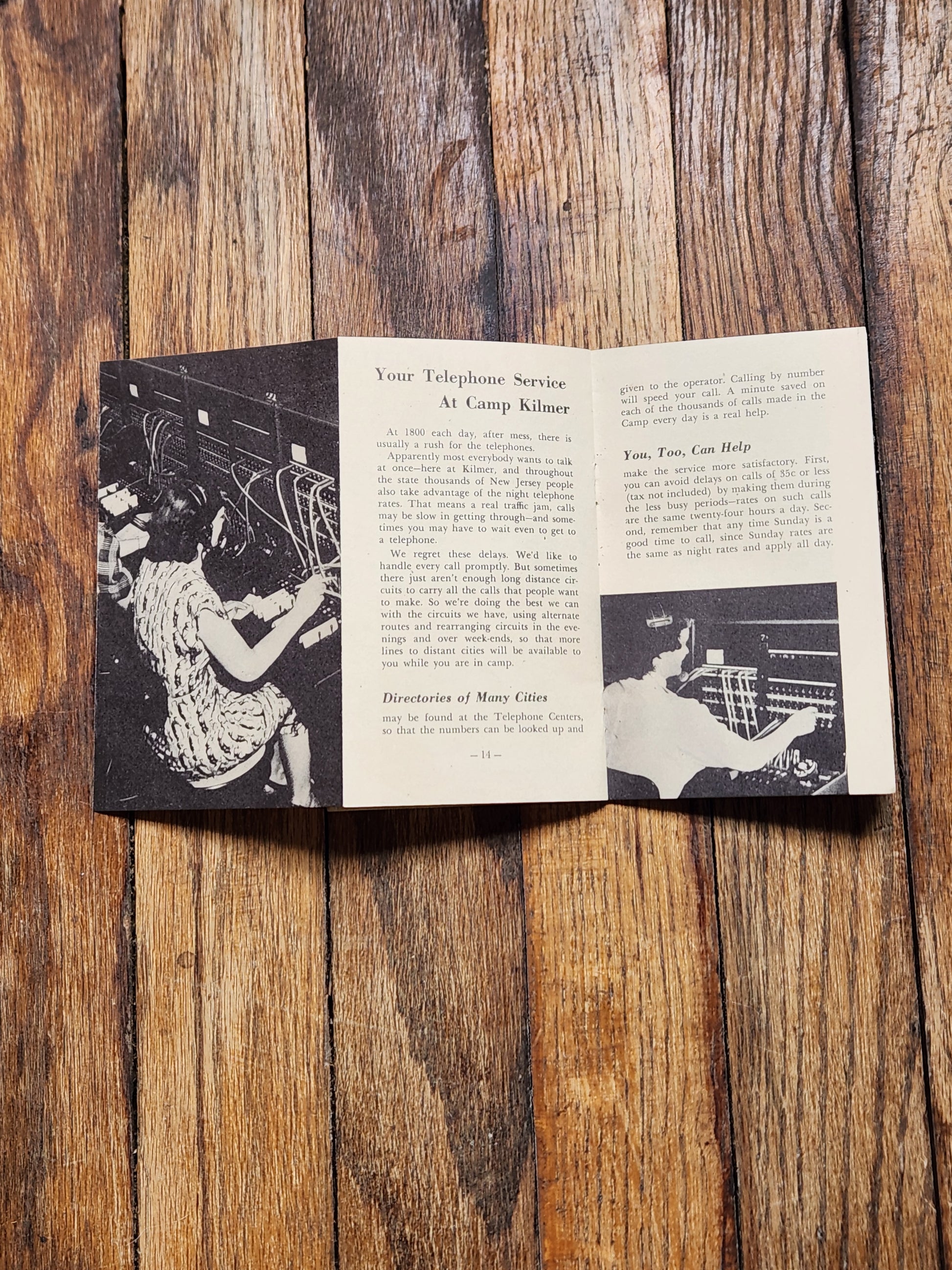 Original pocket-size “Your Camp Kilmer Guide” booklet issued to soldiers at Camp Kilmer, New Jersey. Approx. 6” x 3.5”. Includes camp history, maps, facilities list, and long-distance telephone rates from New Jersey Bell. References the camp’s reactivation in 1950, placing this edition in the early Korean War period.