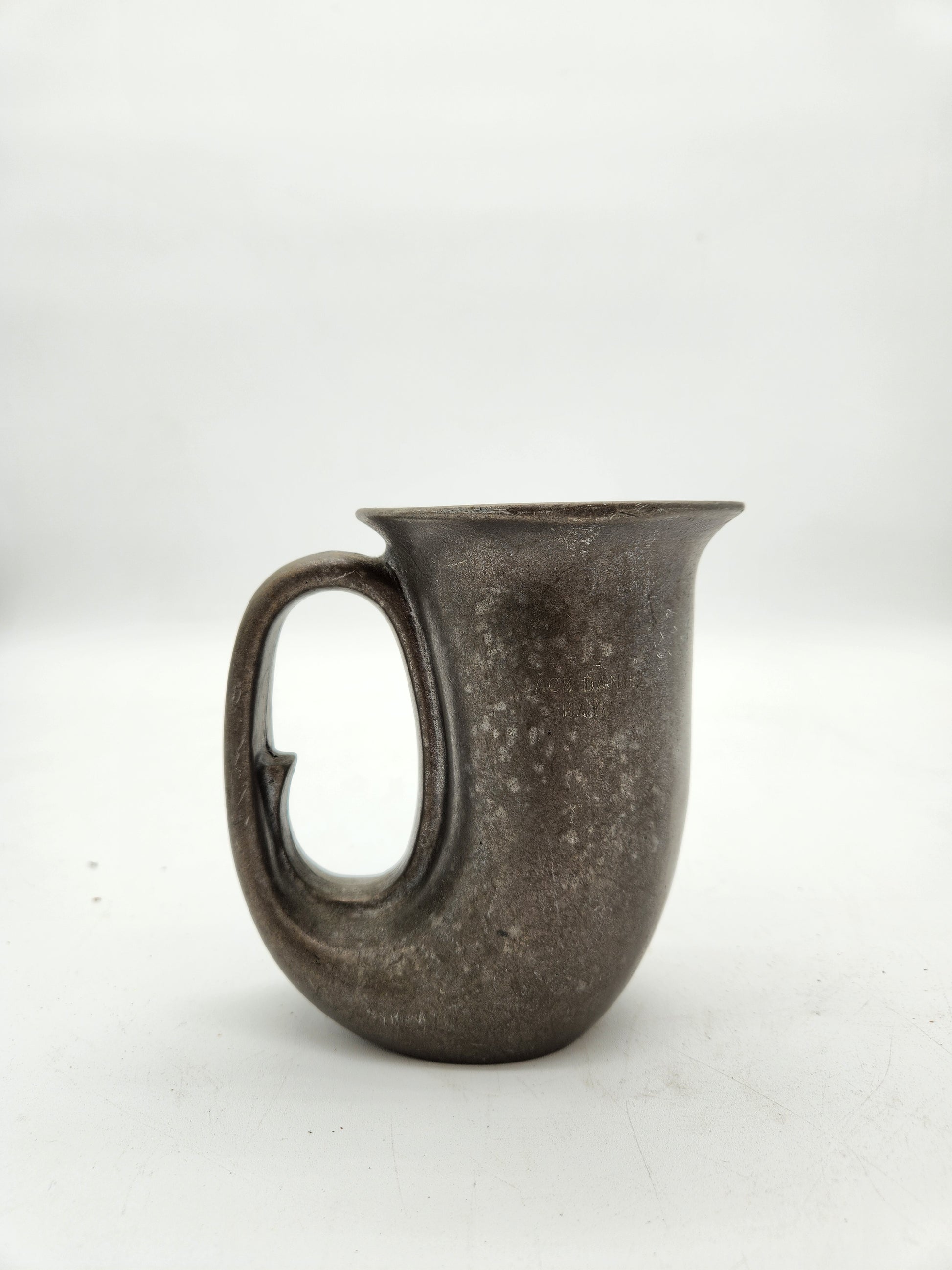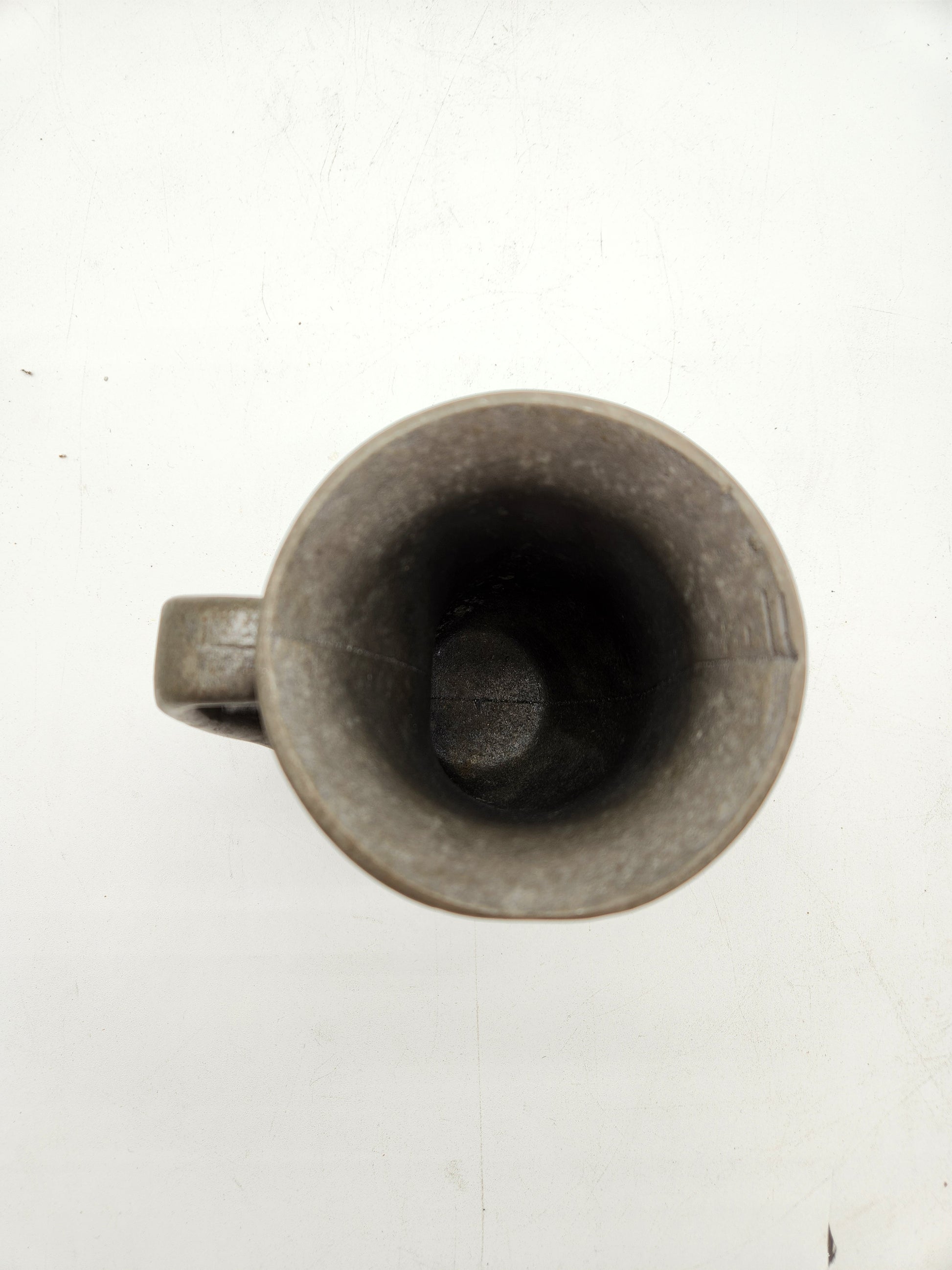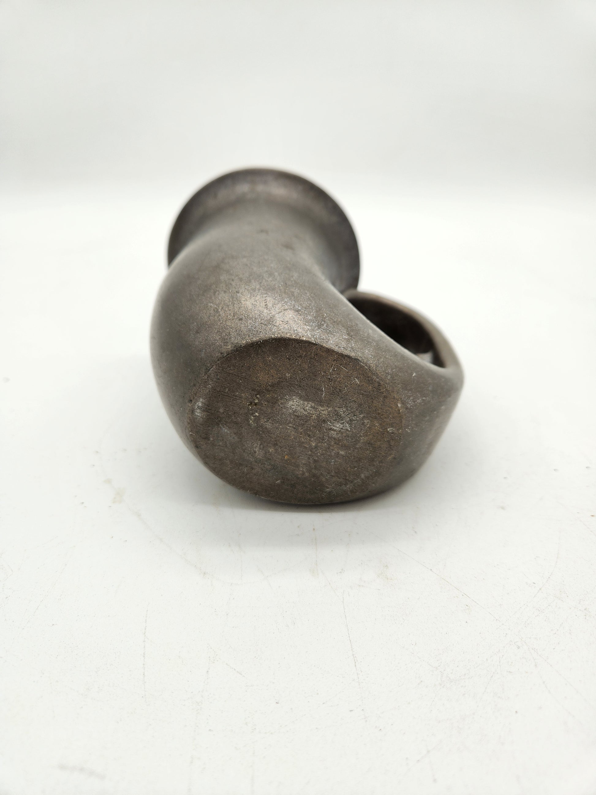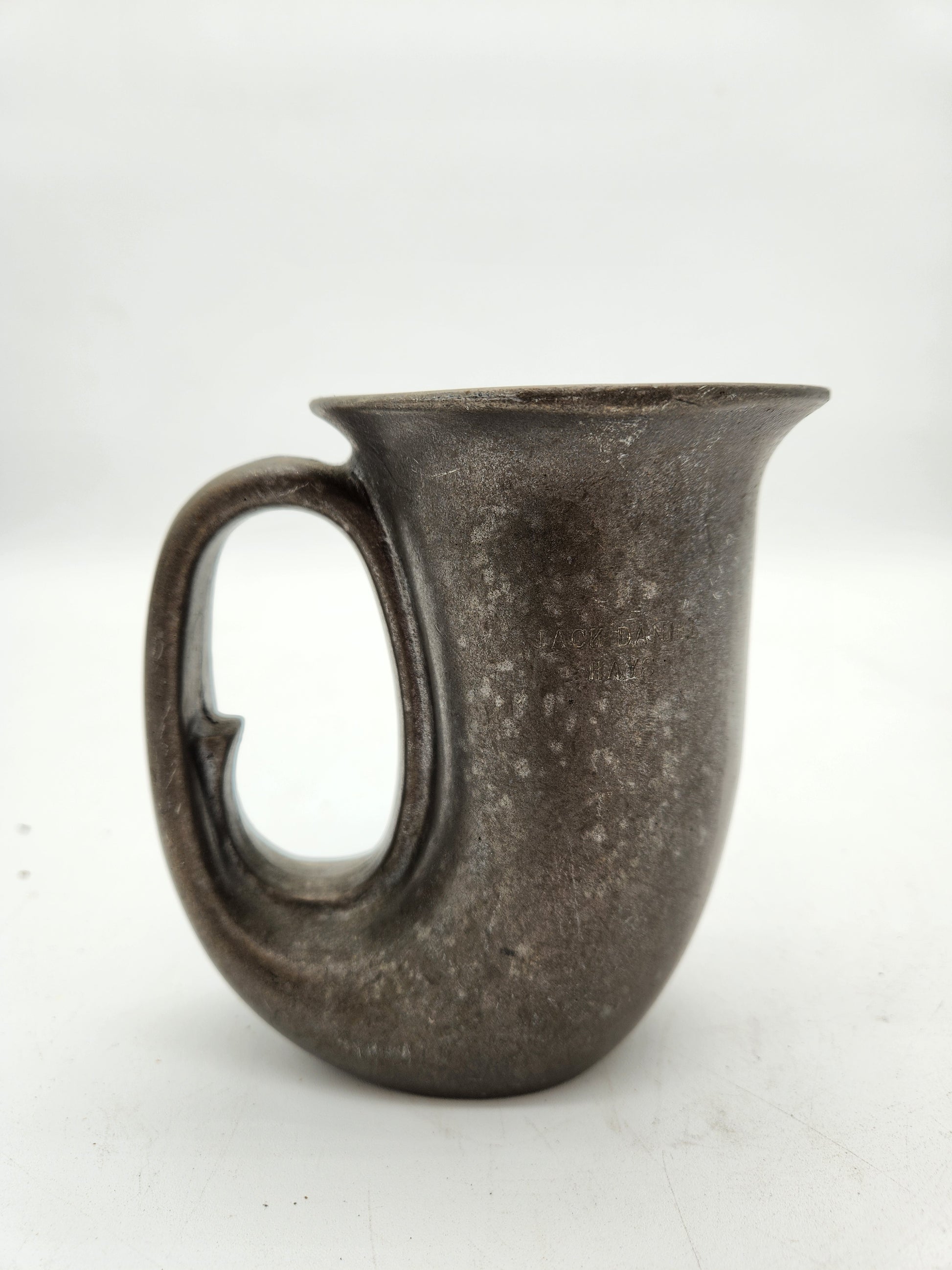 Offered here is a unique vintage cast-metal mug with an unusual sculptural loop handle and flared rim. The side is inscribed “JACK DANIEL HAYS,” likely commemorating the legendary Texas Ranger John Coffee “Jack” Hays (1817–1883). The mug is heavy for its size, with a dark aged patina and scattered spotting consistent with age.