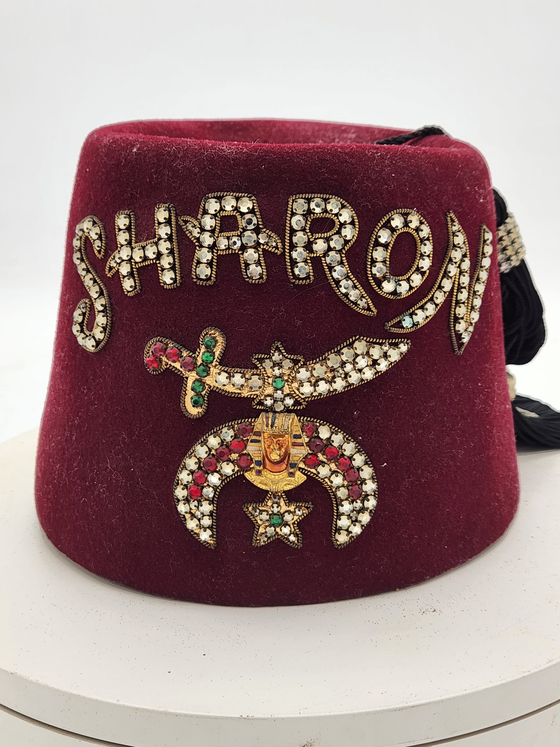 This is a vintage Shriners fez, richly decorated and in very good display condition. The fez is deep maroon felt with the word “SHARON” spelled across the front in large rhinestone-studded letters. Beneath the name is the classic Shriners scimitar and crescent emblem, embellished with multi-colored rhinestones and featuring a gold-tone Pharaoh head at the center. This is likely from Tyler, Texas.