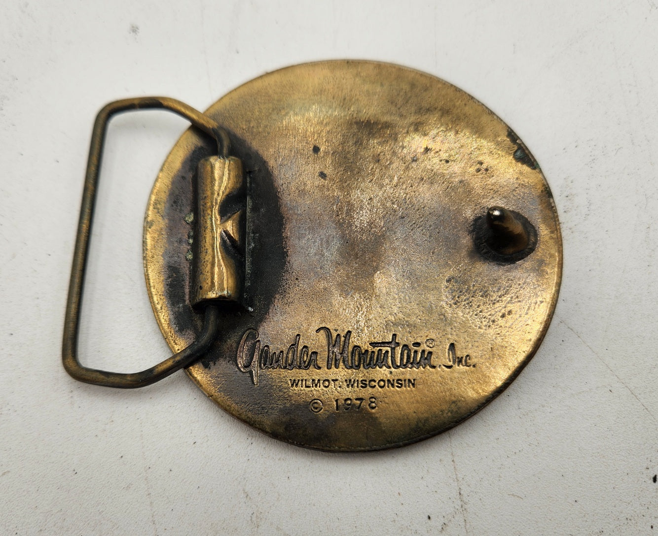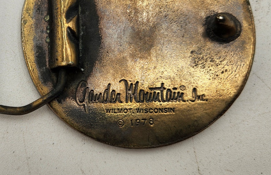 The back of the buckle is engraved with Gander Mountain Innc. Wilmot, Wisconsin 1978.