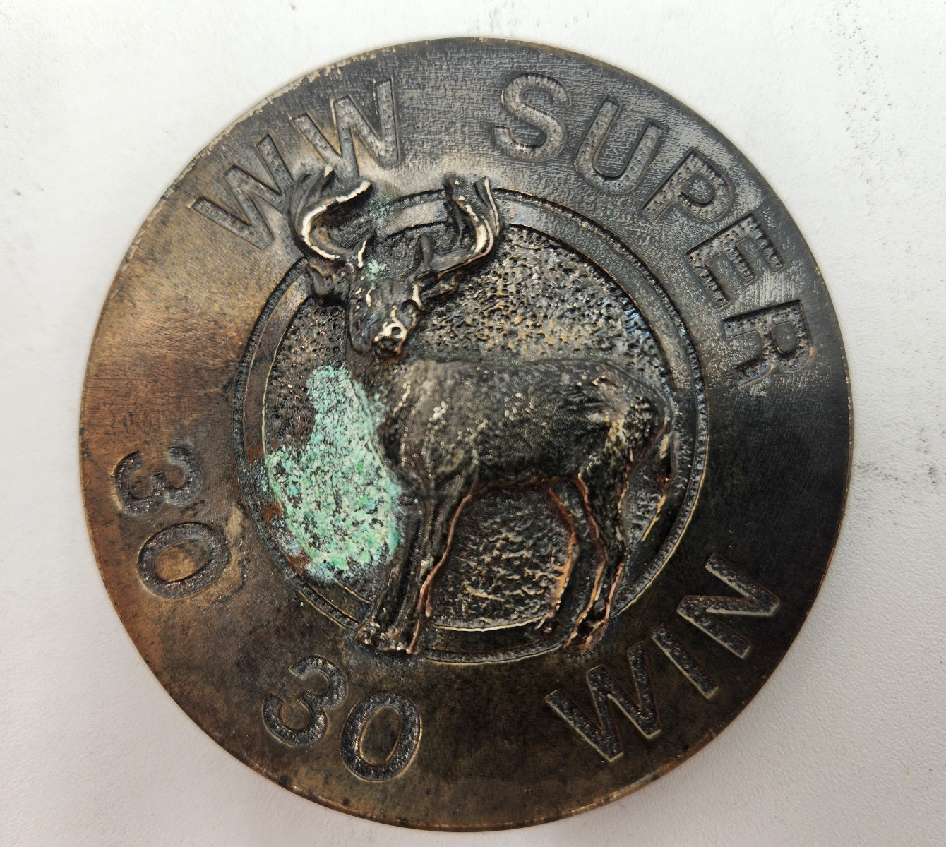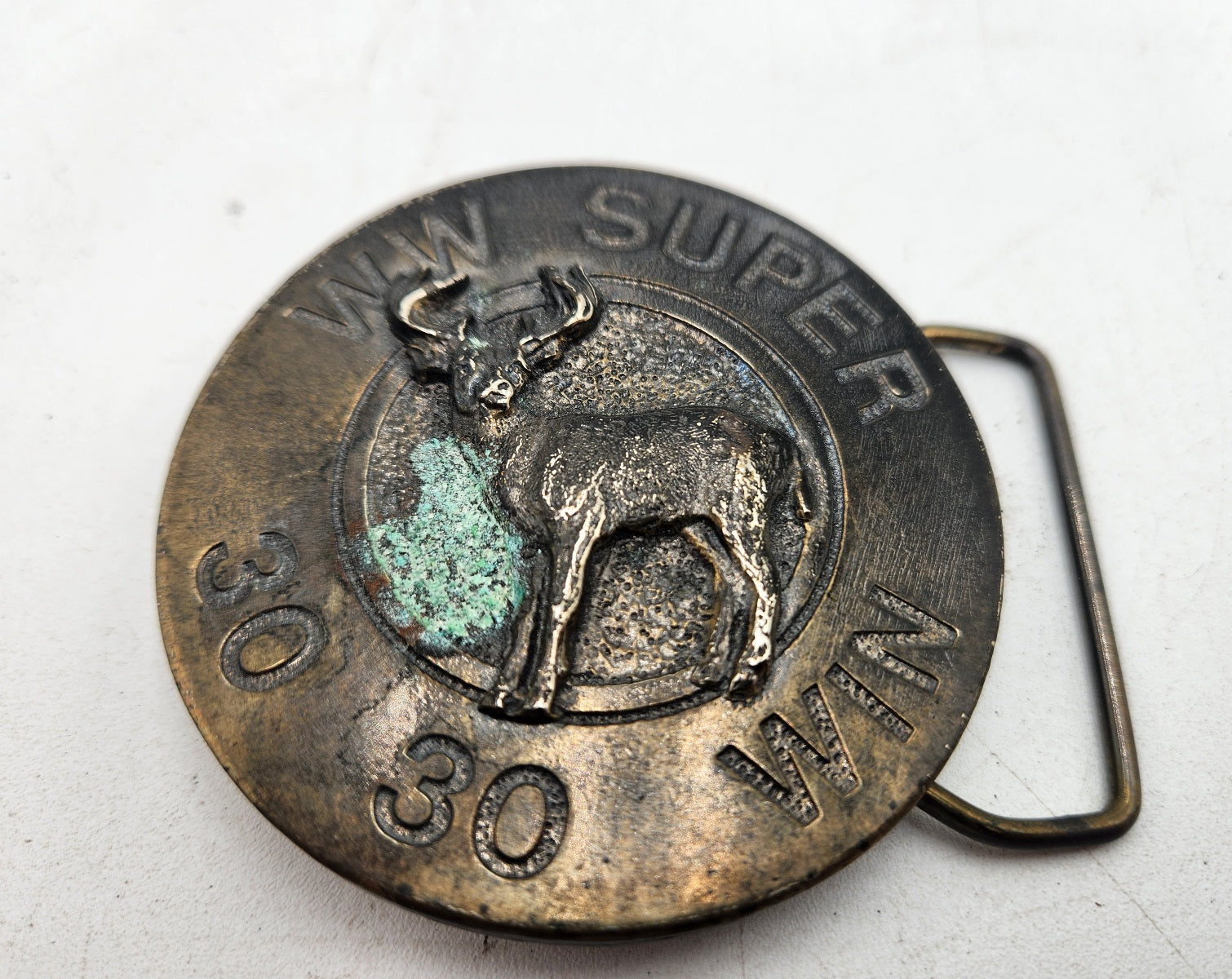 The front of the buckle has a raised buck in the center with the words etched arounc it.