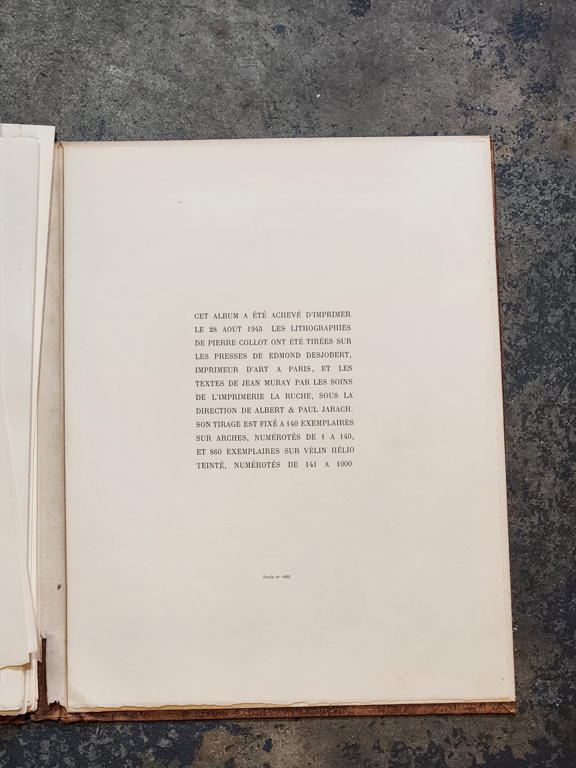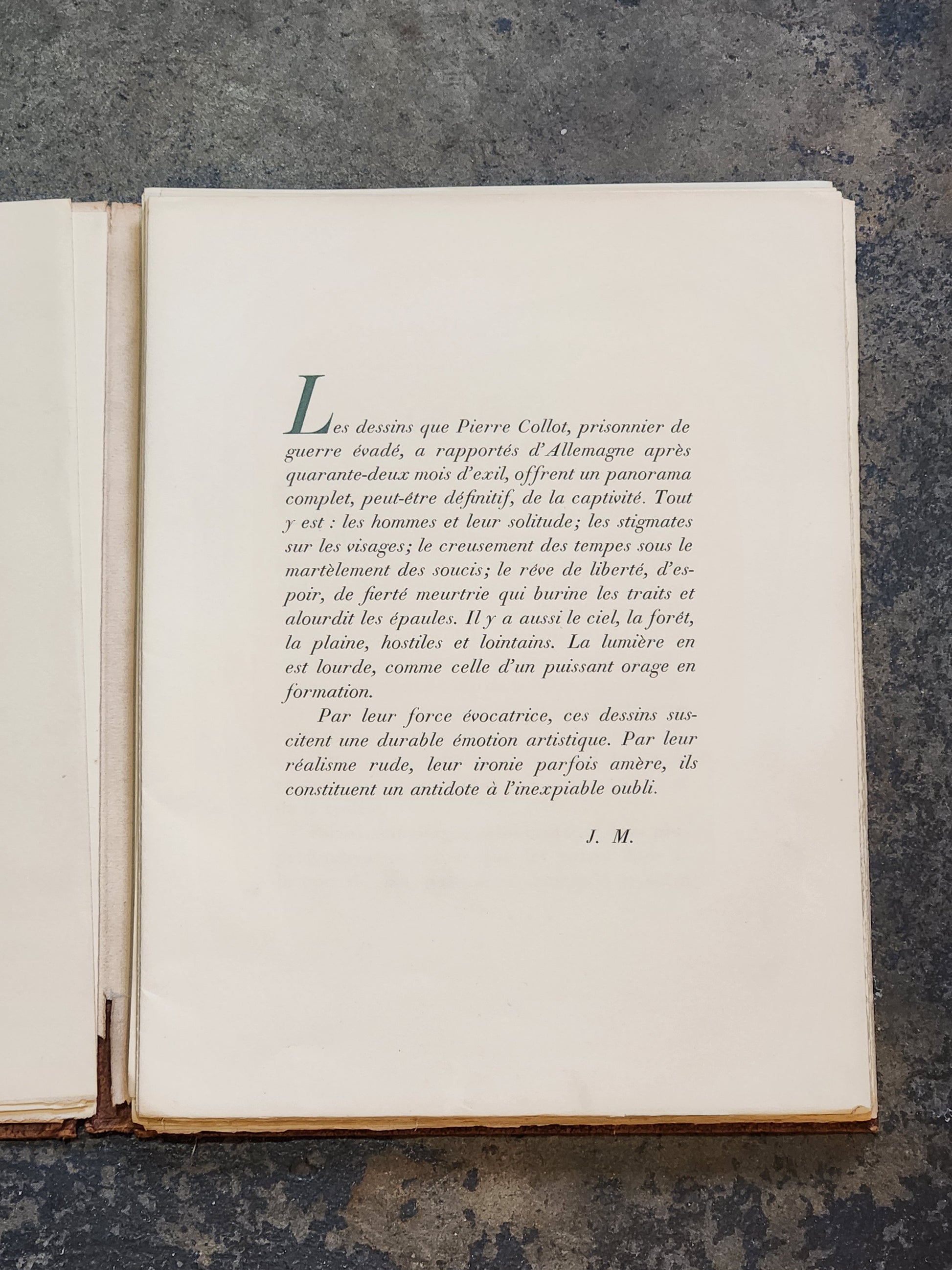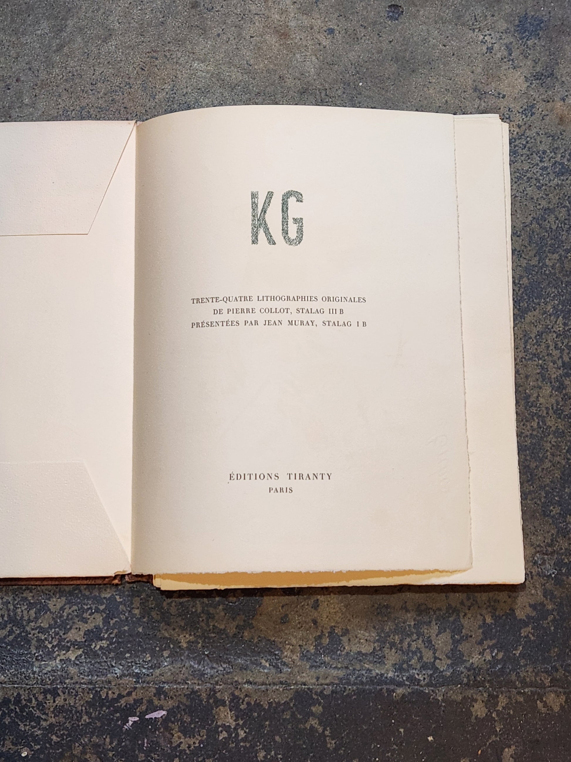 Created just after World War II, KG documents life inside a German prisoner-of-war camp through the eyes of French soldier and artist Pierre Collot. Published in Paris in October 1945, this limited edition contains 34 original lithographs, capturing moments of work, hunger, waiting, and humanity in captivity.
