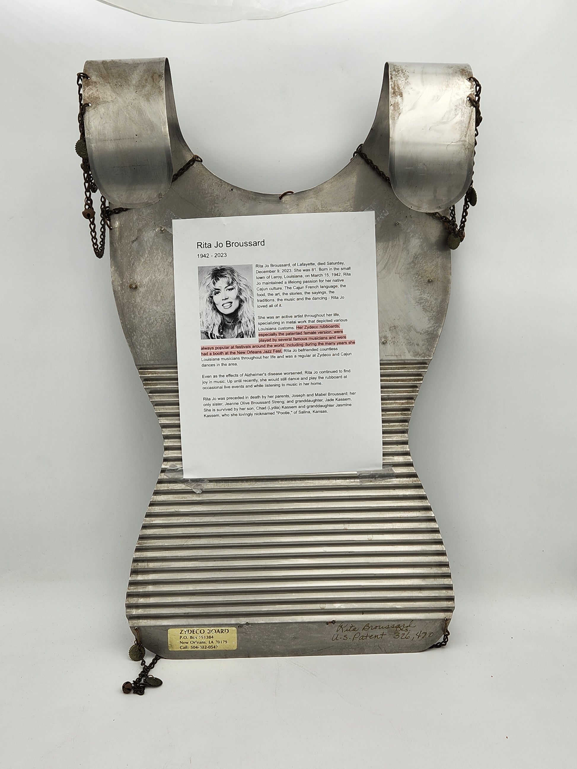 This is a rare Zydeco rubboard made by Rita Jo Broussard (1942 - 2023)